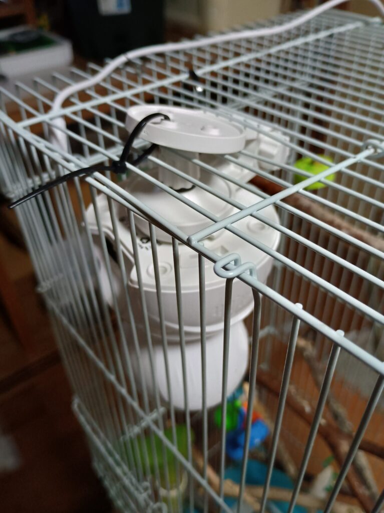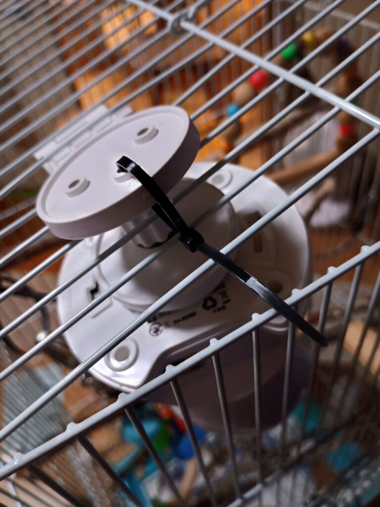 もちろん、カメラをそのまま置いて使用できますが、今回は、夜間、カバーをかけても観察できるように、この様にケージの天井に結束バンドで取り付けます。