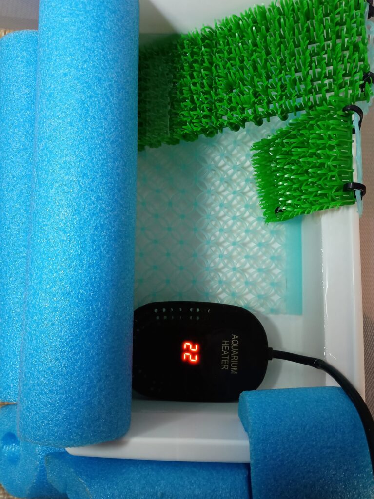 夏の間:夏の間はヒーターは切っており、室温はエアコンをつけて26~28℃で水温は22~24℃ぐらいになっています。バスキングライトは使用せず、紫外線ライトにしています。