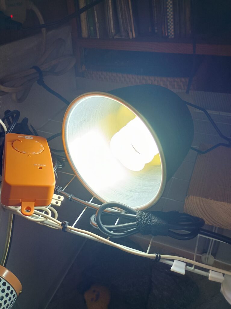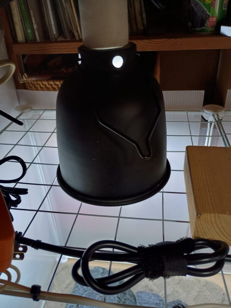 夏は紫外線のみのライトでしたが、冬は保温機能、紫外線機能も付いているバスキングライト兼用の紫外線に変更しいつでも体を温められるようにしています。