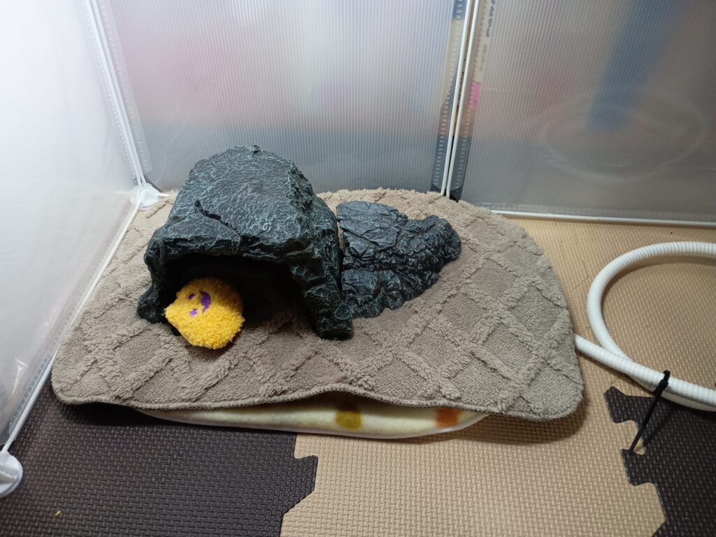 冬場はシェルターの下に28℃に設定したペット用ホットカーペットを敷いてます。
