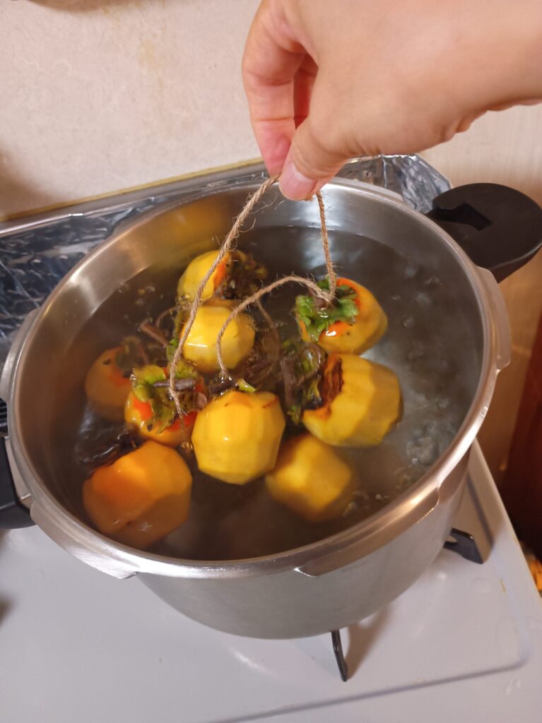 中身がはみ出さない程度に指で優しく揉みます。さらに、また数日後に揉むことで渋が抜けて早く甘くなります。