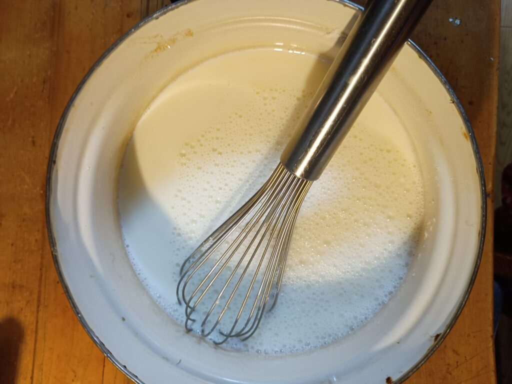 ⑤薄力粉が混ざった牛乳を鍋に入れて、煮る。