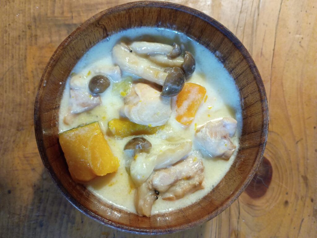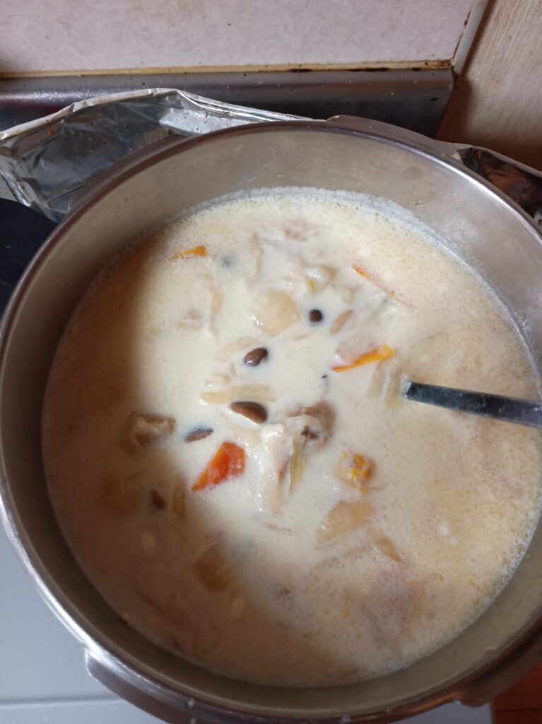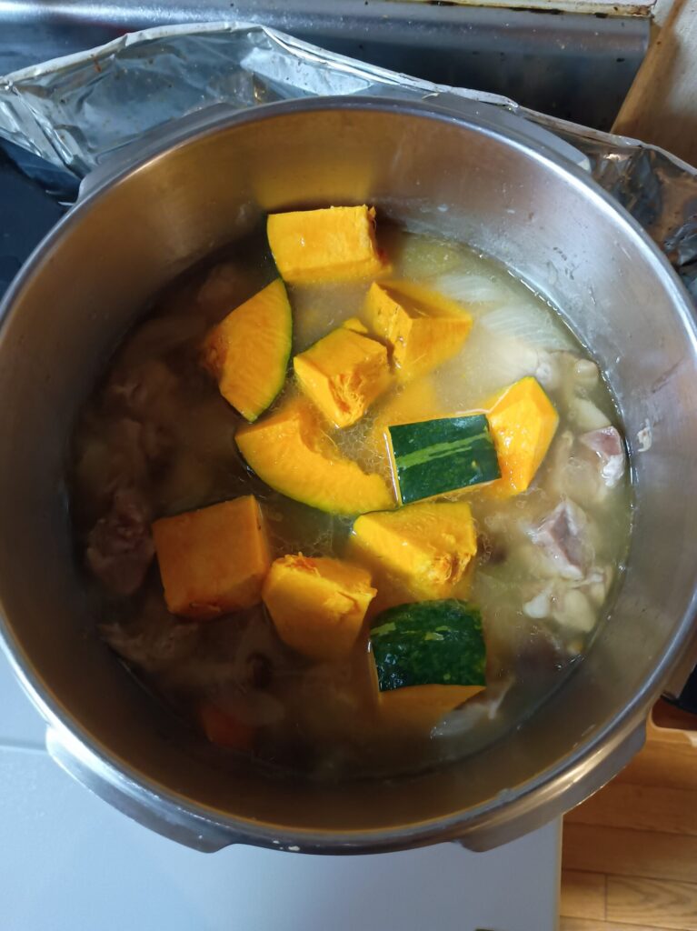我が家の鍋は圧力鍋なので、カボチャもいっしよに入れると溶けてなくなってしまうので、後で入れます。