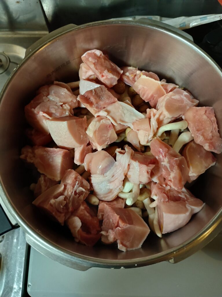 ②水と鶏ガラスープを入れて圧力鍋で煮る。